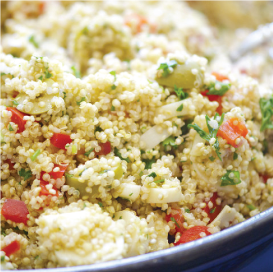 Combine cooled quinoa, tomatoes, parsley, green onion, mint, garlic, basil, olives, red pepper and hearts of palm in a bowl. Season with salt, pepper, olive oil and lemon juice to taste. Cover and chill for about an hour or so to allow the flavors to blend. Taste to check seasoning, and serve piled high in a bowl or platter.